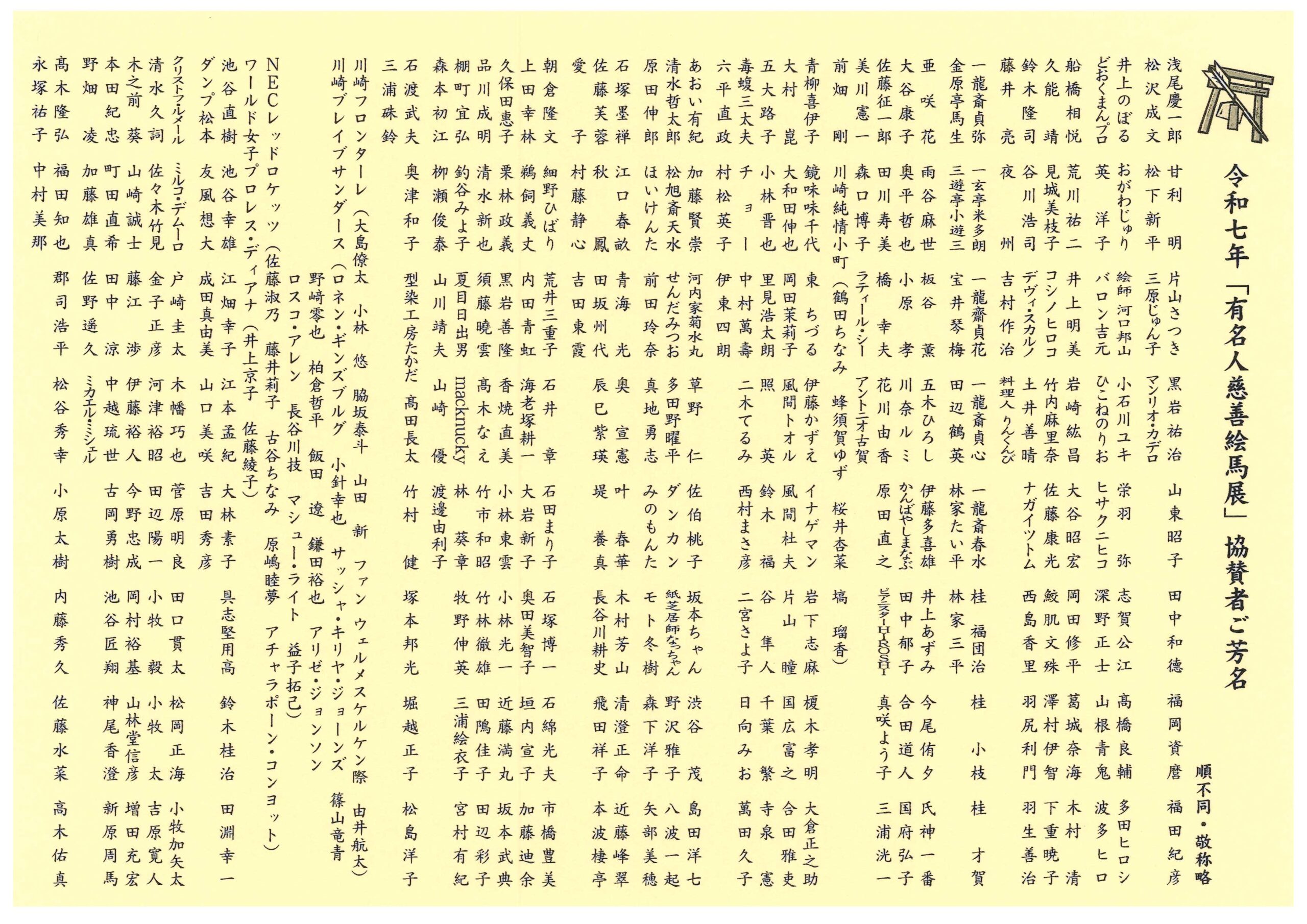 有名人慈善絵馬展 令和7年「有名人慈善絵馬展」協賛者ご芳名一覧 (順不同・敬称 略) 2025.12.17 ◇稲毛神社での展示 … 1月1日~1月7日◇川崎モアーズでの展示 … 1月9日~1月31日(予定) 画家・書家・芸能人など、各界で活躍する有名人の手による絵馬約 200枚を境内に展示。絵馬は入札制によりご希望の方へと授与され、益金は(財)毎日新聞東京社会事業団に寄託し、社会福祉事業に役立てられます。 Post Share Hatena Pocket RSS feedly Pin it 有名人慈善絵馬展 歳旦祭(1/1) 初天神祭(川崎天満社例祭)(1/25) 関連記事 平成31年「有名人慈善絵馬展」協賛者ご芳名一覧 (順不同・敬称 略) 令和2年「有名人慈善絵馬展」協賛者ご芳名一覧 (順不同・敬称 略) 平成28年「有名人慈善絵馬展」協賛者ご芳名一覧 (順不同・敬称 略) 令和6年「有名人慈善絵馬展」協賛者ご芳名一覧 (順不同・敬称 略)