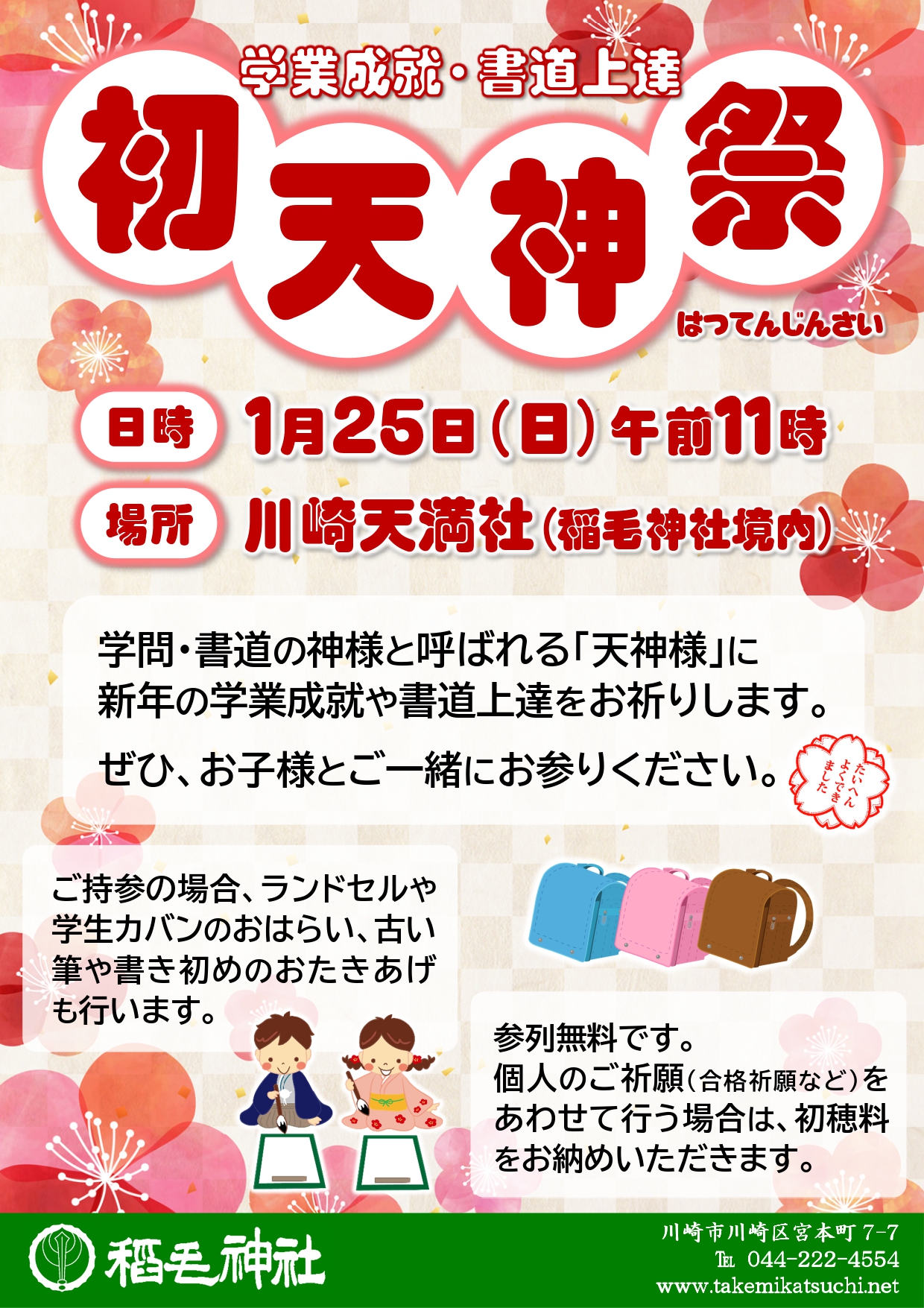 祭事の予定 初天神祭(川崎天満社例祭)(1/25) 2025.12.17 ◇1月25日(日) 11時 稲毛神社の境内に鎮まる川崎天満社(かわさきてんまんしゃ)の例祭です。天満社には、学業の神様や書道の神様と呼ばれる菅原道真(すがわらのみちざね)公が祀られています。ぜひお子様とご一緒にご参列いただき、今年の学業成就・書道上達をお祈りください。●新年の学業成就・合格祈願を行い、ランドセル・カバンをお祓いします。●新年の書道上達祈願を行い、古い筆はお焚き上げします。 Post Share Hatena Pocket RSS feedly Pin it 祭事の予定 令和7年「有名人慈善絵馬展」協賛者ご芳名一覧 (順不同・敬称 略) 節分祭(2/3) 関連記事 八坂神社例祭(6/7) 七夕(7/7) 七五三(11月ごろ・随時) 節分祭(2/3)