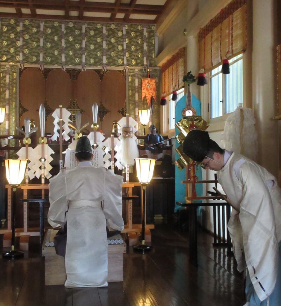 「大麻頒布始祭」の「大麻」は神棚に祀るお神札の事を意味し、お神札の頒布(はんぷ/配って広く行き渡らせる事)を始めるにあたって神前に奉告を行う祭典です。